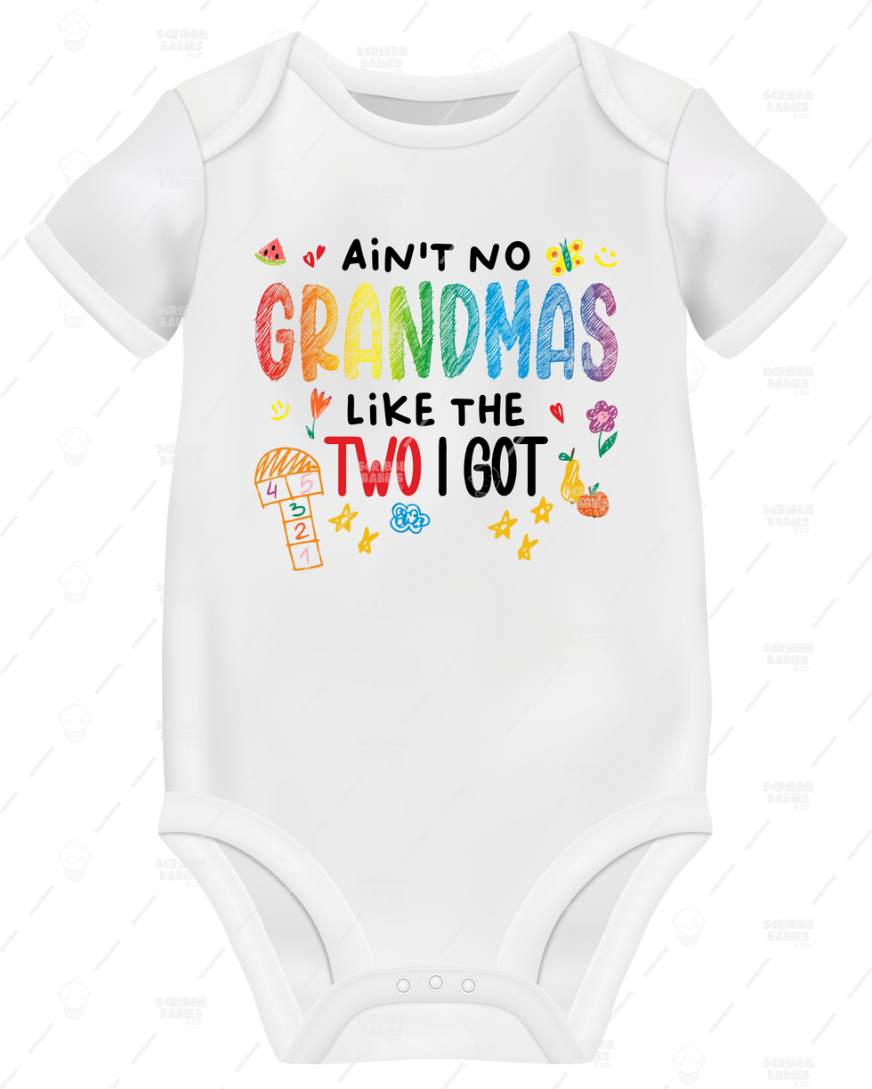 Elevate your little one's wardrobe with our AIN'T NO GRANDMAS LIKE THE TWO I GOT ONESIE, exclusively available at Scribble Babies.