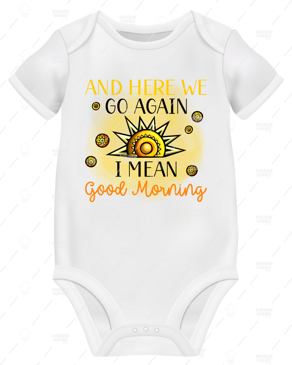 Elevate your little one's wardrobe with our AND HERE WE GO AGAIN I MEAN GOOD MORNING ONESIE, exclusively available at Scribble Babies & Co.