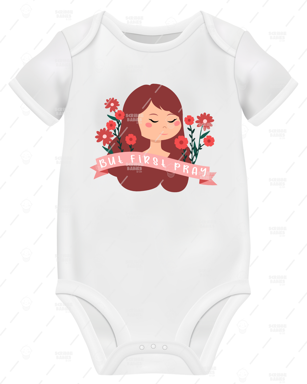 Elevate your little one's wardrobe with our BUT FIRST PRAY ONESIE, exclusively available at Scribble Babies.
