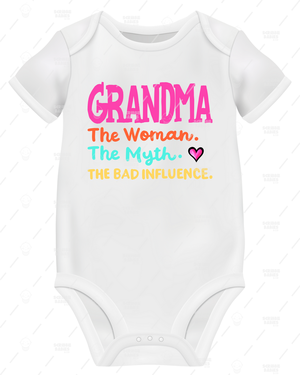Elevate your little one's wardrobe with our GRANDMA THE WOMAN THE MYTH THE BAD INFLUENCE ONESIE, exclusively available at Scribble Babies.