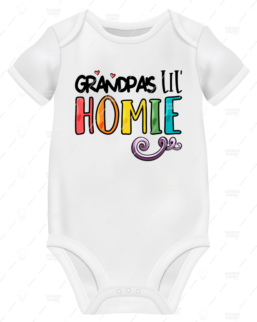 Elevate your little one's wardrobe with our GRANDPA'S LIL' HOMIE ONESIE, exclusively available at Scribble Babies.