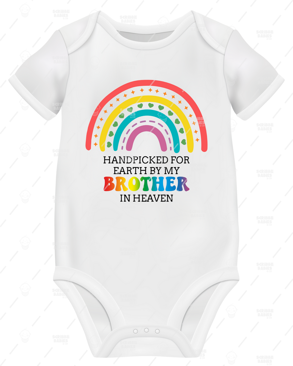 Elevate your little one's wardrobe with our HANDPICKED FOR EARTH BY MY BROTHER IN HEAVEN ONESIE, exclusively available at Scribble Babies.