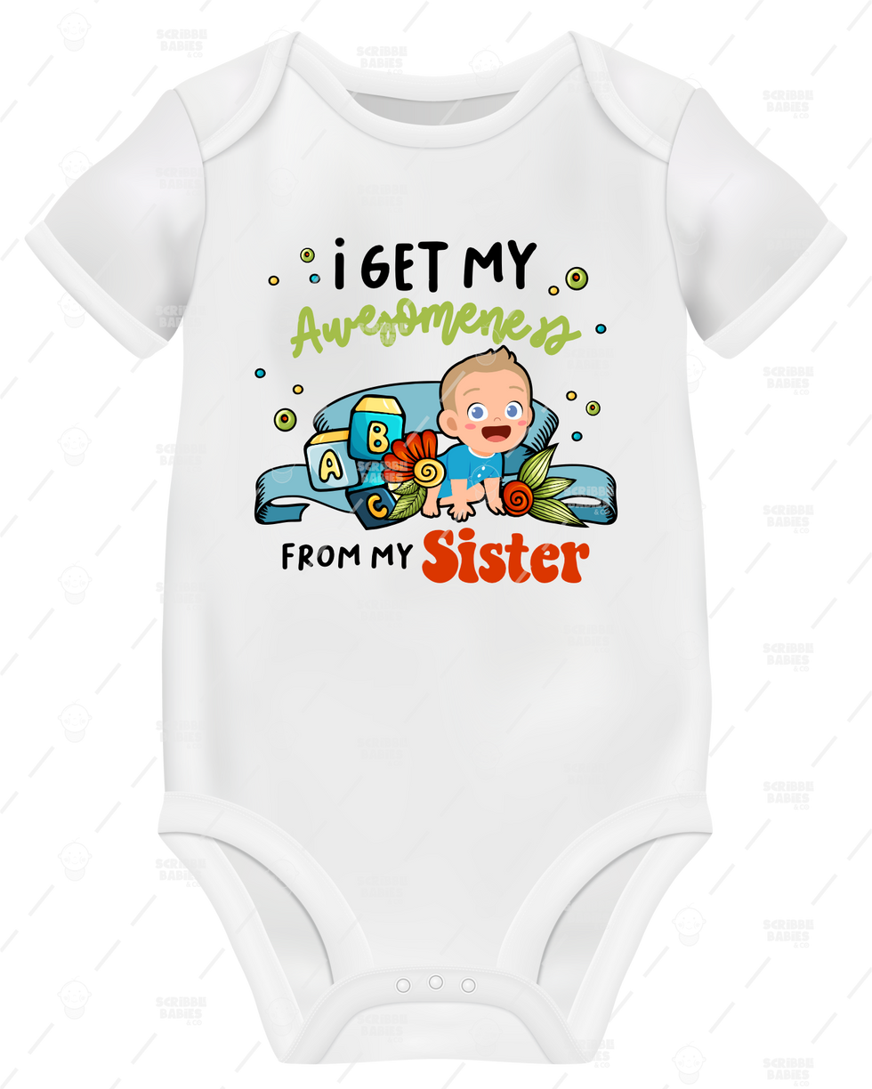Elevate your little one's wardrobe with our I GET MY AWESOMENESS FROM MY SISTER BOY ONESIE, exclusively available at Scribble Babies.
