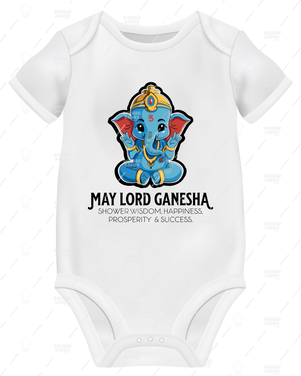 Elevate your little one's wardrobe with our MAY LORD GANESHA SHOWER WISDOM, HAPPINESS, PROSPERITY & SUCCESS ONESIE, exclusively available at Scribble Babies.