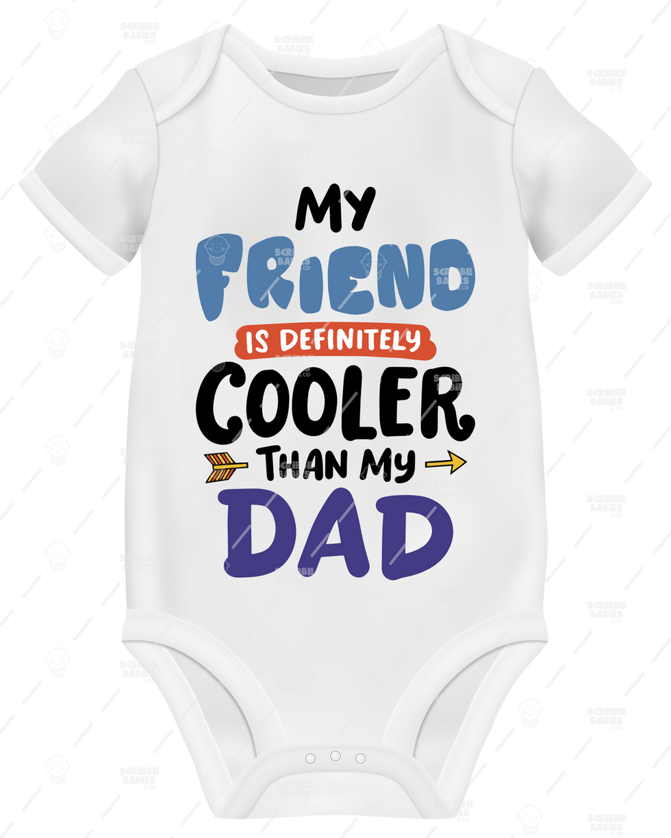 Elevate your little one's wardrobe with our MY FRIEND IS DEFINITELY COOLER THAN MY DAD BOY ONESIE, exclusively available at Scribble Babies.