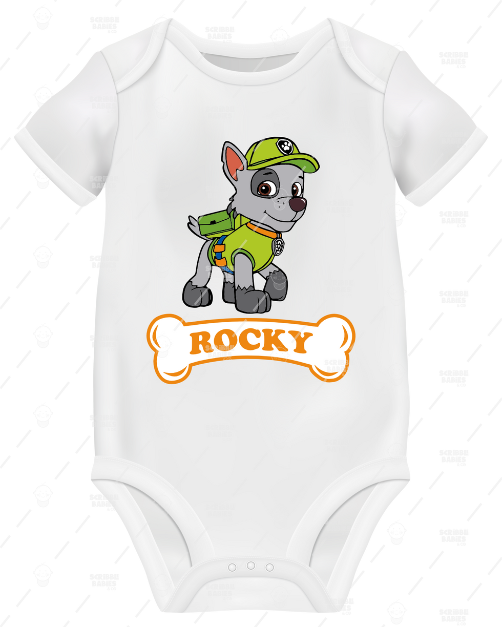 Elevate your little one's wardrobe with our PAW PATROL ROCKY BONE ONESIE, exclusively available at Scribble Babies & Co.