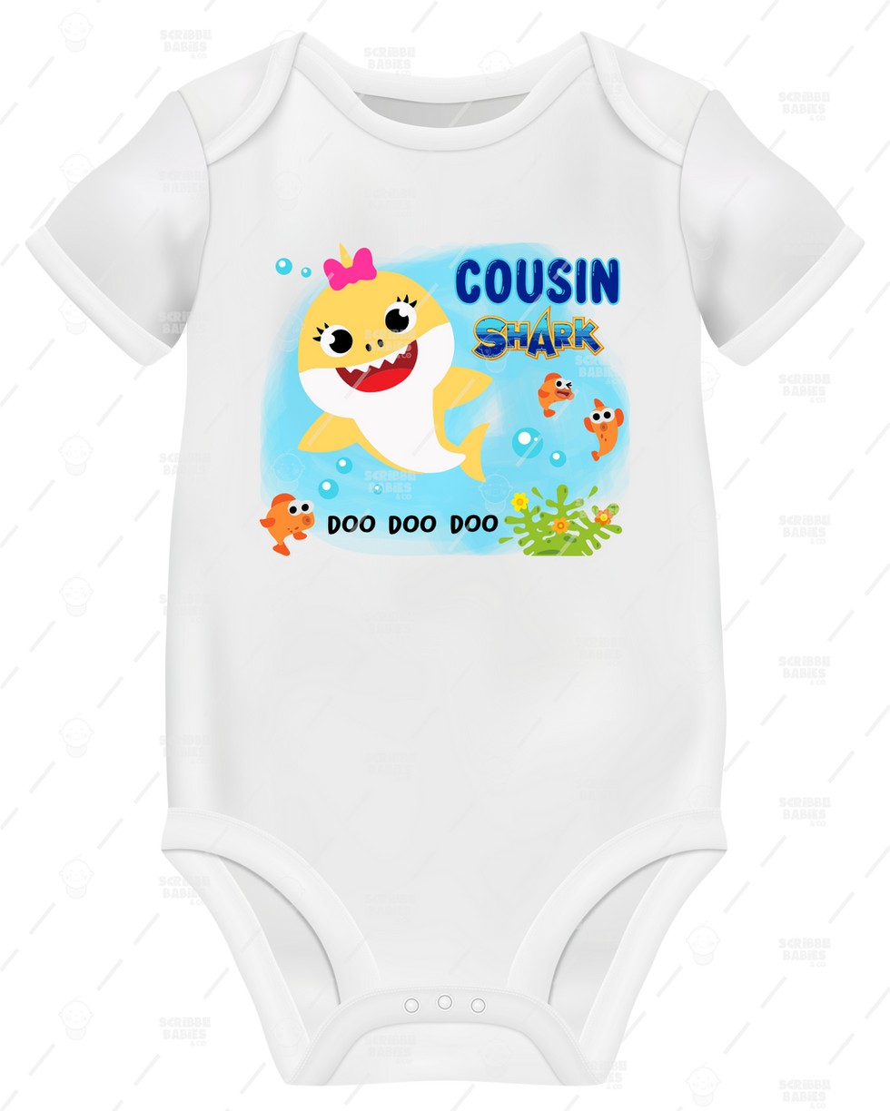 Elevate your little one's wardrobe with our COUSIN SHARK GIRL ONESIE, exclusively available at Scribble Babies.